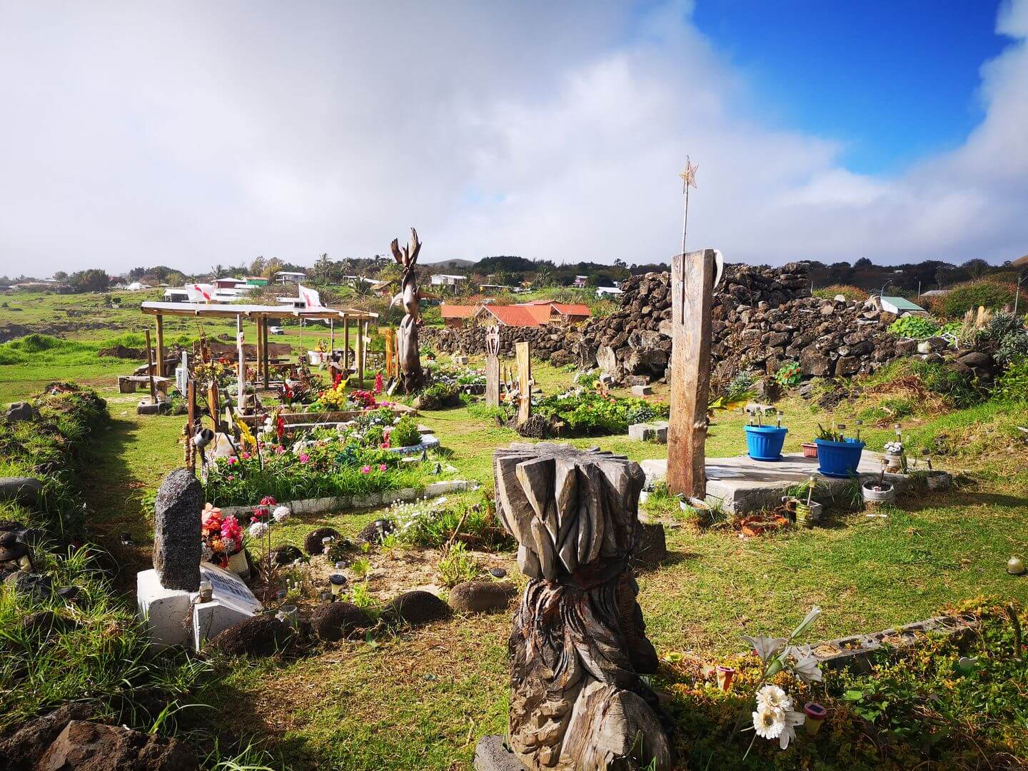 The cemetery in Hanga Roa is unlike any other we’ve seen. The tombs are decorated with bright colours, carved symbols, and even small moai figures, blending local traditions with more recent influences.